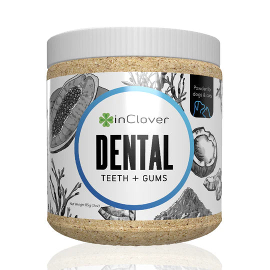 DOES MY PET NEED THIS? InClover's Dental supplement is scientifically formulated as a daily powder to help protect your pet's pearly whites and sweeten their breath. Tasty and easy to use (sprinkle at mealtime daily) this powder dental supplement is great for dogs and cats of all ages and all life stages and can be sprinkled on all food types for cats and dogs before daily mealtime.