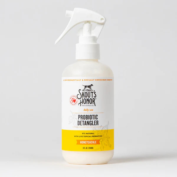 Skout’s Honor Probiotic Detangler goes beyond basic grooming sprays to actively support your pet's skin microbiome with the power of live, topical probiotics. This hydrating solution features a live, colony-forming probiotic kefir to help soften, smooth, and quickly release tangles and mats, making at-home grooming easier on both you and your pet. Backed by science and powered by nature, Skout’s Honor Grooming solutions help your pet look, feel, and smell better than ever.