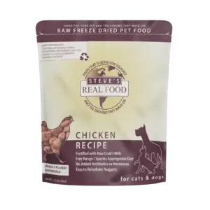Steve’s Chicken freeze-dried raw pet food uses free-range, biologically-fed chicken. The Chicken recipe is high in manganese and magnesium, which are crucial for ligament health, and has a mid-range fat and protein profile, making it a good option for high-energy dogs. Steve’s uses the B.A.R.F. formulation, making our meat-to-produce ratio at 80%/20%. It is packed full of functional foods that provide protein and all the essential vitamins and minerals that help promote strong bones and support healthy organ function. A freeze-dried chicken recipe is complete and balanced for all stages of life and can be fed to dogs and cats.